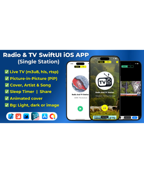 Radio And TV SwiftUI is a sleek and modern streaming app that brings both high-quality radio and live television directly to your device. Enjoy crystal-clear audio with formats such as MP3, AAC, and ALAC, while experiencing smooth video playback with formats like MP4, HLS (.m3u8), and MOV.